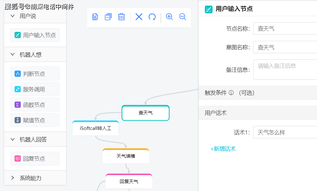 在朗深的中間件實(shí)現(xiàn)方式中,在IVR菜單中增加了一個(gè)機(jī)器人對(duì)話節(jié)點(diǎn),所以IVR菜單轉(zhuǎn)機(jī)器人就只是相當(dāng)于IVR流程走到了機(jī)器人的節(jié)點(diǎn),這樣避免了一次中繼轉(zhuǎn)接過(guò)程。