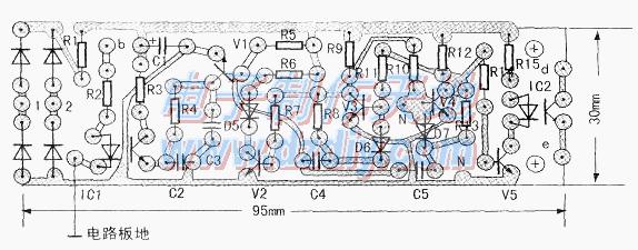 圖中電阻R1選用1/4W碳膜電阻,其余全部用1/16W碳膜電阻。ICl、IC2選用PC817光電耦合器,D5用φ3mm藍色高亮度發(fā)光管,固定在面板的適當位置,V3、V4最好配對使用,B值>150,其余元件的參數(shù)如圖中所標注。將元件按下圖對應焊接在電路板上,固定在電話機內空閑處,因話機內空間高度有限,安裝C1時應臥置,K選用微型撥動開關,固定在電話機后部(如不使用定鬧功能。可省略K。將R2直接與a點連接),復位按扭N可選用電話機上的一個不常用按鍵。將該按鍵下面兩端的引線切斷作為復位按扭使用;電路中a點連接電話機中鬧鐘信號的輸出端“MUTE”接點(各種話機的顯示板同主板的連接排線均有“MUTE”標注)。CX是電話機中體積最大的無極性電容器,一般都采用1uF/250V,比較好找。測量CX兩端的直流電壓,將其低電位一端的線路切斷(圖中打×處)作為d、e端。連接好電路后不用調試即可正常工作。