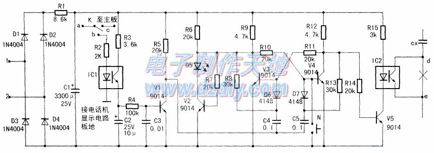作者:劉福啟 劉文 現(xiàn)在的電話機功能比較齊全,大都"具有來電顯示、免提、暫停/重撥、定鬧、回撥/追撥、lP撥號、鈴聲選擇、計算器等諸多功能。HCD8688P/TSDL型全國通用來電顯示電路比較具有代表性。采用該電路的電話機社會擁有量較大。筆者認為,功能如此齊全的電路沒有定時免打擾功能是一個缺憾,對喜歡午休的人來說,入睡后如果被電話鈴聲驚醒、將是非常煩惱的事情。有的人怕電話鈴聲影響午休,采取拔掉電話線(或者長時間摘機)的方法,但是每天午休前后都要對電話線進行拔、插,特別是午休后如果忘記插上電話線,也會影響電話機的正常使用,甚是麻煩。在佰靈通HCD8688(8)P/TsDLC型電話機上。利用該機的鬧鐘功能增加部分元件,使電話機在不影響其它功能的情況下具備了定時免打擾功能,免打擾時間可任意設定隨時更改,非常方便,設定時間<24小時,精確到分鐘。所增加的元件不需外加電源供電,經半年使用穩(wěn)定可靠,適合廣大電子愛好者自制。工作原理:路如下圖所示。電話外線電壓經D1~D4無極性變換、R1限流后。為后級電路提供工作電源。電路中V3、V4、R8一R13、D6、D7、C4、C5構成雙穩(wěn)態(tài)觸發(fā)器,平時V3處于導通狀態(tài)、V4處于截止狀態(tài),電流經R12、R14,使V5導通,IC2中的發(fā)光二極管有電流流過而發(fā)光,其光敏三極管導通;電路中CX為電話機鈴流電路中的隔直降壓電容器,IC2中光敏三極管的c、e極串接在電容CX的回路中。如果有電話打來.其振鈴電壓通過IC2中光敏三極管的c、e極構成回路而發(fā)出振鈴聲。電話機處于正常工作狀態(tài)。電路中的a點接至電話機的定鬧信號輸出端,當a點有方波鬧鐘信號輸出時,經R2使ICl中的發(fā)光二極管和光敏三極管導通,通過R3向C2充電,C2上的電壓很快上升,當C2上的電壓上升到V1的導通電壓時,V1飽和導通:其集電極電壓的突然下降。通過C4、D6使觸發(fā)器狀態(tài)反轉,V3截止,V4導通,V5因失去基極電流而截止,IC2中發(fā)二極光管和光敏三極管亦截止,切斷了電話機的鈴流回路,再有電話打進來時不再發(fā)出振鈴聲而進入免打擾狀態(tài);當?shù)诙昔[鐘信號出現(xiàn)時,雙穩(wěn)態(tài)電路再次翻轉,免打擾狀態(tài)即被解除。R6、D5、V2、R7組成發(fā)光指示電路。在免打擾狀態(tài)下V3截止,V2導通,D5發(fā)光,指示電話機處于免打擾狀態(tài)。電路中C1的容量選用比較大,在此有濾波和續(xù)流作用,以保證電路在各種狀態(tài)下的穩(wěn)定性;電路中使用了fCl、IC2兩個光電耦合器,消除對話機電路的影響,ICl內發(fā)光二極管的負極應接顯示電路板的地。這樣可適應各種電話機電路;K為定鬧、免打擾轉換開關;N為復位按紐,按下N可立即解除免打擾狀態(tài)。由圖可見,在免打擾狀態(tài)下,只是切斷了電話機的鈴流回路,不影響來電顯示、撥出電話和其它功能。而且午休時間結束后。電話機會輸出30秒鐘的聲響(比鬧鐘聲小的免提摘機忙音)催你起床。你可根據來電顯示,有選擇地回復未接電話。 元件選擇及制作: