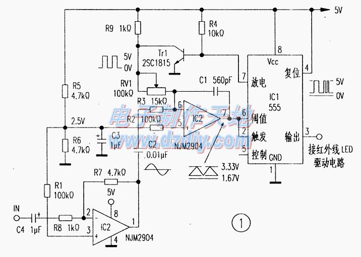 聲音信號通過電阻輸入運放,電容被充放電。充放電的終結(jié)時間是變化的,電流的變化改變了脈沖的占空比。與聲音信號成比例的電流可得到線性良好的脈沖調(diào)幅。因為運放的輸入電壓被恒定為2.5v.故在電阻上流入成正比的輸入信號電流。
