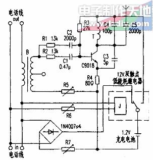 自制電話機(jī)話音無線傳輸器 作者:四川 夏歡 近日,偶然找到一張2002年的《電子報(bào)》。看到一篇名為《最簡錄音電話》的文章,受到啟發(fā),并組裝了電話機(jī)無線監(jiān)~聽~器。現(xiàn)與大家分享。如有不妥之處,請指出。 特點(diǎn):此電路結(jié)構(gòu)簡單,所用元件少、成本低、易于組裝。用調(diào)頻方式無線傳輸信號,再用普通調(diào)頻收音機(jī)接收(工作范圍≥15m),可長期駐留在電話線上。 1.工作原理 此電路串聯(lián)在電話線上,當(dāng)電話掛機(jī)時,電話線電壓(后簡稱線電壓)在50V以上。此時,繼電器吸合,使充電電路導(dǎo)通,給電池充電。當(dāng)電話摘機(jī)時,線電壓降至10V左右。此時繼電器線圈停止工作,使充電電路斷開,調(diào)頻發(fā)射電路導(dǎo)通。發(fā)射電路將電話的來電信號發(fā)射出去(注:變壓器B的作用是感應(yīng)線上音頻信號,并將信號供給發(fā)射電路)。
