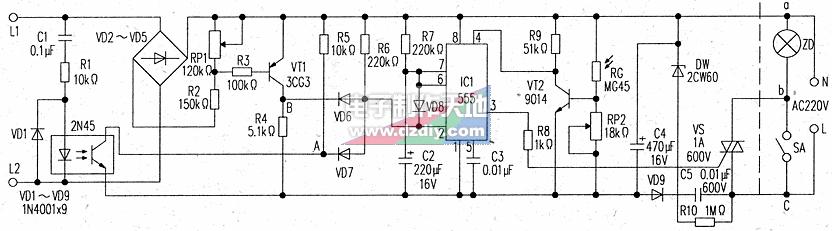 1.電位器RP2的調試方法(1)RP2暫調到阻值最小一端,(2)接上AC220V電源(注意.火線、零線不可接反,以免控制部分直接接火線),ZD必然處于點亮狀態(因為IC1②腳通過VD6和R4接地),(3)逐漸增大RP2阻值,當ZD熄滅時,再稍微增加一些即可。這時,只要用手捂上RG,ZD就會點亮,放開手ZD就會熄滅。