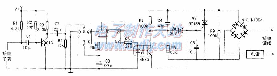 作者:牛余朋 公司或企業辦公室里都有電話,下班后有些值班人員私自偷打辦公室電話,從而造成公司話費的增加。為杜絕這種現象,制作了這款控制電路,在白天正常上班時間,電話可以用,能接能打。下班后電話自動上鎖,只能接不能打,第二天上班后,電話又自動解鎖,正常接打,從而有效的解決了上述問題。一、電路原理:如圖所示,兩個D觸發器分別構成單穩態和雙穩態電路形式。平時,兩觸發器不工作,其輸出端均為.零,光電耦合器不導通,電話線上的48V直流電壓在電阻R8上的壓降不足以將穩壓管擊穿,可控硅截止,電話無法撥出。當早上上班時,電子表鬧鈴響,其鈴聲信號經電容C1耦合,三極管放大,并經電容C2,加在第一個D觸發器的直接置位端,使由其構成的單穩態電路被觸發翻轉為高電平,再利用此上升沿使由第二個D觸發器構成的雙穩態電路翻轉為高電平,Q2輸出高電平,光電耦合器得電導通,這樣,電阻R8兩端的電壓便直接加在了可控硅VS的控制極,使其被觸發導通,電話便可以正常撥打。晚上下班后,電子表第二次鬧鈴響,整個電路狀態翻轉,光電耦合器截止,可控硅也隨之截止,電話便無法撥出了,但這時可以接聽,原因是當有電話打進時,電話線上的90V交流電壓經整流,R7、R8分壓后足可以使穩壓管DW擊穿導通,這時便可以接聽電話,接聽完畢掛機后,可控硅因無維持電流,自行關斷,另外。筆者在可控硅的兩端并聯了一個大電阻,這樣.當非正常上班時間時,即使可控硅不導通.電話打不出,但電話的聽筒中還會有微弱的電流聲,這樣便會迷惑偷打電話之人,以為是電話有故障,從而放棄撥打。