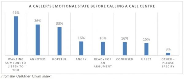 現實情況是,每個呼叫中心座席都必須面對以消極心態進行聯絡的客戶并解決他們的問題。CallMiner客戶流失指數顯示,超過三分之一的客戶(36%)表示他們是帶著煩惱來的;六分之一(16%)是生著氣來的,同樣的比例是腦子混亂準備爭吵來的!
