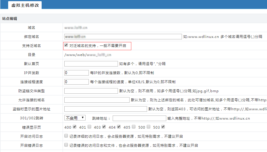 如果我們需要讓主機/站點支持泛解析域名,那我們需要在"對泛域名的支持,一般不需要開啟"勾選,然后在綁定域名里添加*.域名設置。