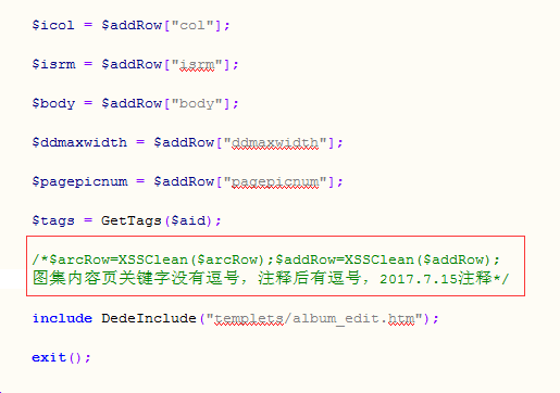 如果是圖片集的編輯,那么找到該頁面的php文件,位于后臺dede目錄下的album_edit.php,搜索XSSClean,找到代碼$arcRow=XSSClean($arcRow);$addRow=XSSClean($addRow); 把該段代碼注釋掉就可以了,如圖所示: