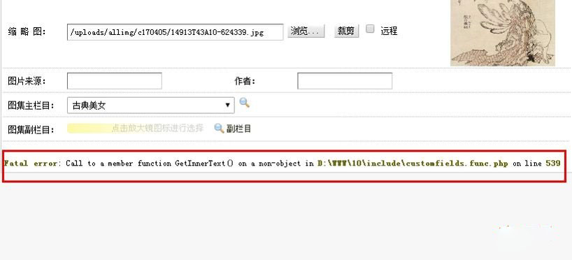 織夢修改或者添加了自定義字段為圖片或者添加自定義表單后在后臺修改文章的時候出現如下錯誤:Fatal error: Call to a member function GetInnerText() on a non-object in \include\customfields.func.php on line 539