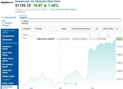 感恩節之前的本周三美國股市收盤時,亞馬遜股價為1156. 16 美元,較前一交易日1139. 49 美元的收盤價上漲了16. 67 美元,漲幅為1.46%,股價也再次創下新高。