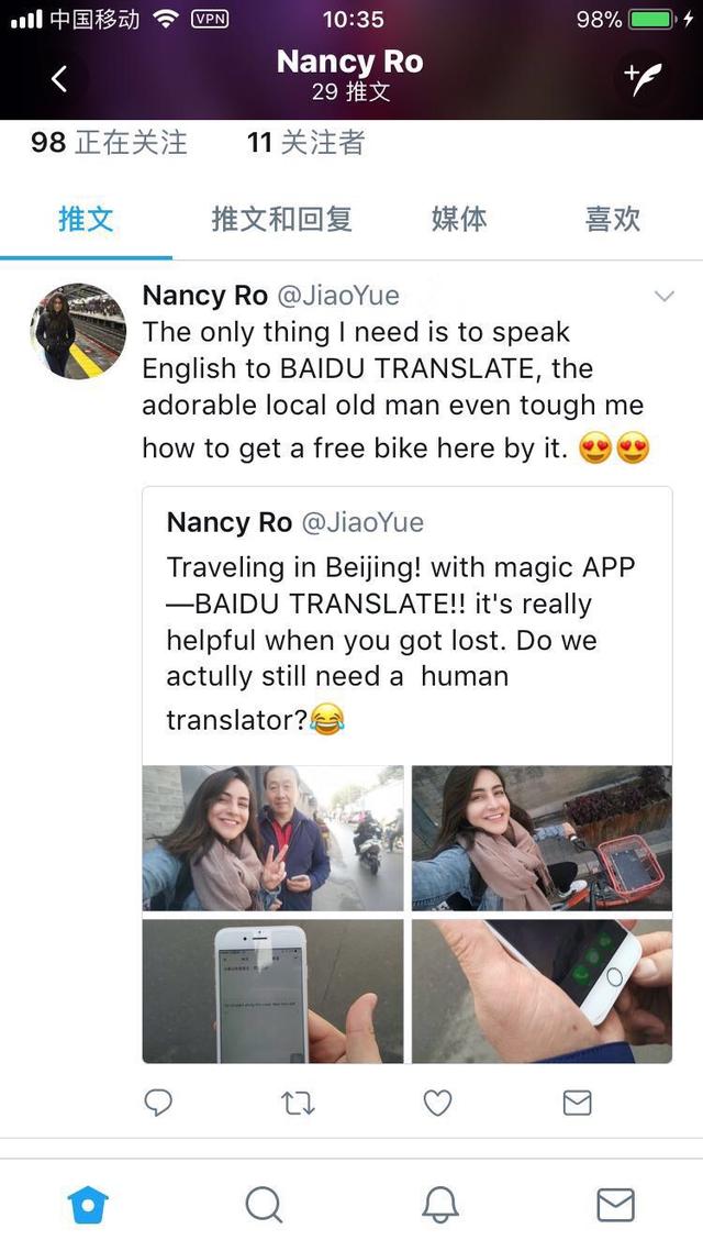 隨著全球化的不停發展,翻譯作為跨語言溝通的橋梁,在國際合作、經貿往來和文化交流等各個方面發揮著越來越重要的作用。近日,一位名叫Nancy的美國網友在推特上分享了本身的中國旅行故事。她提到,當她在北京胡同中迷路時,一位本地白叟通過百度翻譯APP成功為她指路,而且還為她介紹了許多本地的風土人情。她把這段有趣的經歷分享在推特后,引起了網友們的討論,還被外國媒體報道。故事中的“翻譯神器”百度翻譯,也受到了國表里網友的追捧。