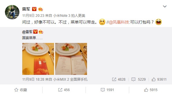 還有網友好奇:“可以打包嗎?”沒想到,雷軍也進行了回復:“問過,好像不成以。不過,菜單可以帶走。”