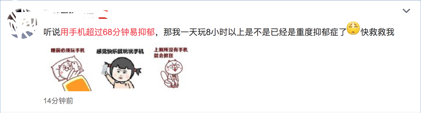消息出來之后,引發(fā)了網(wǎng)友的熱議,很多網(wǎng)友體現(xiàn)“離開手機 8 分鐘都會抑郁”,“ 68 分紅抑郁,我一天玩 8 個小時手機已經(jīng)是重度抑郁了”,“ 68 分鐘就抑郁,一天 680 分鐘怎么破?”,“已患抑郁癌晚期”等等,也以此評論,對此陳訴體現(xiàn)驚詫,不成置信。