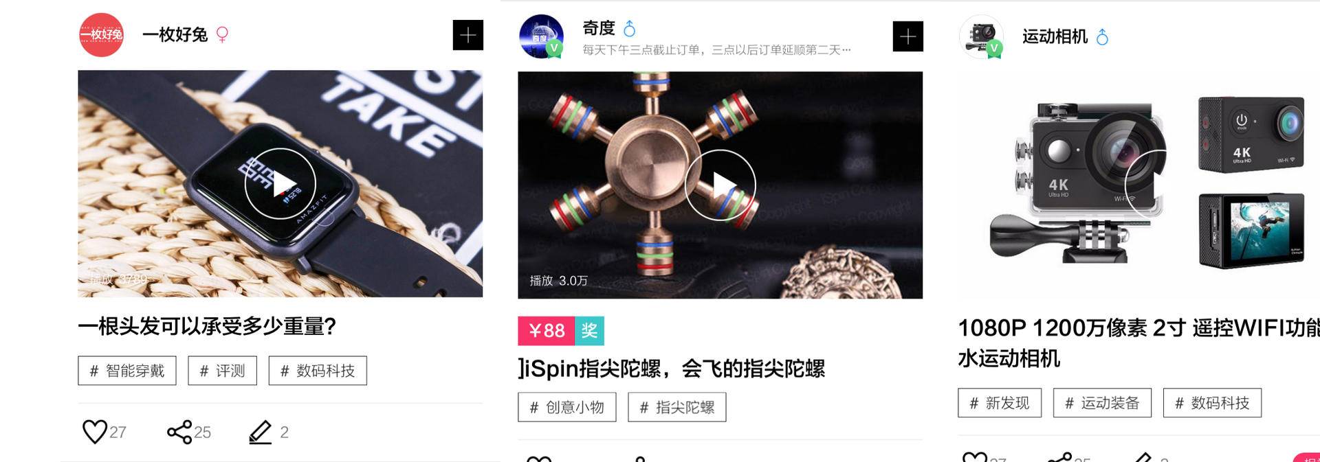 并且其中還有:短視頻+智能硬件,短視頻+社交,短視頻+電商等差別維度的創(chuàng)新。一方面,智能硬件產(chǎn)品容易形成發(fā)燒友聚集,自帶社群效應(yīng)。另一方面,智能硬件更新頻率快。每天都有大量“黑科技”產(chǎn)品面市。一方面用戶可以將視頻通過第三方社交平臺分享出去,包孕秒拍、微信伴侶圈、新浪微博、QQ空間等,社交元素的結(jié)合增加了平臺的趣味性和用戶粘性,吸引了越來越多的用戶。