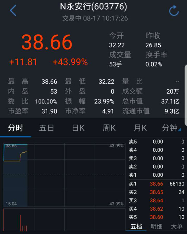 鈦媒體快訊 |8 月 17 日消息:今日,共享單車第一股永安行正式上市。開盤即一字漲停,漲幅43.99%,報收38. 66 元。以開盤價計算,永安行總市值達30. 9 億元。