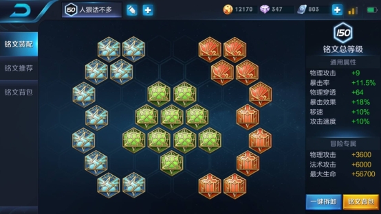 銘文:10個鷹眼10個狩獵5無雙5禍源,比擬以往三個10的銘文,藍煙這次的銘文有些均衡,物理攻擊、攻速、移速、暴擊率和暴擊效果都兼顧到了。