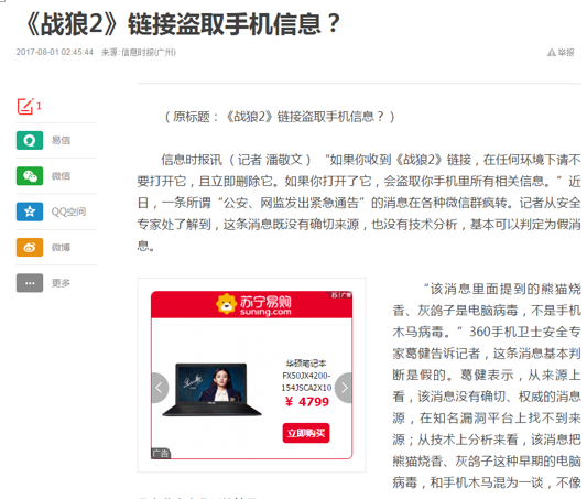《戰狼2》的連環殺讓很多用戶感到防不勝防,擔心本身“中招”。不過,從《戰狼2》病毒的傳播來看,這樣的“套路”其實早已有之。作為識別詐騙、釣魚套路的“老司機”,360手機衛士的專家一眼就看出了這個信息里的bug。360手機衛士安適專家體現,雖然很多關于手機病毒的謠言都自稱是公安、網監發布的,但相關權威網站上卻沒有找到這個消息,如果是權威機構發布的,傳播上也不成能通過微信群來傳播。這條消息既沒有確切來源,也沒有技術分析,基本可以判定為假消息。