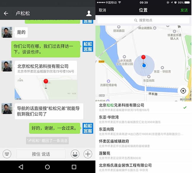 地址增加好之后,過一天,就能在騰訊地圖里搜到公司信息了。只要被騰訊地圖收錄,在微信里、QQ里都能便利的把位置信息發給客戶。