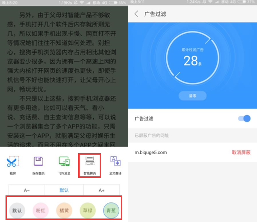 在瀏覽體驗上,網(wǎng)頁護(hù)眼色功能和廣告過濾,相對來說是一些瀏覽器都具備的功能,護(hù)眼色就是為小編這樣的重度手機(jī)依賴患者準(zhǔn)備的。廣告過濾自然是讓那些“彈彈彈”的垃圾廣告在眼前徹底消失。護(hù)眼色功能在底端的菜單欄里可以看到,廣告過濾功能則在設(shè)置里。