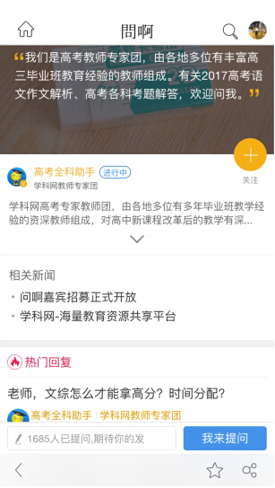 UC問啊借助由諸多教育界知名志愿填報專家、高級教師、校長等組建的高考教師專家團,實時在線為考生們解答包孕各地高考政策、高考核心考點、年度高考題型等各種類型在內的高考熱門問題,讓考生能夠安放心心上考場,面對疑難各個擊破。