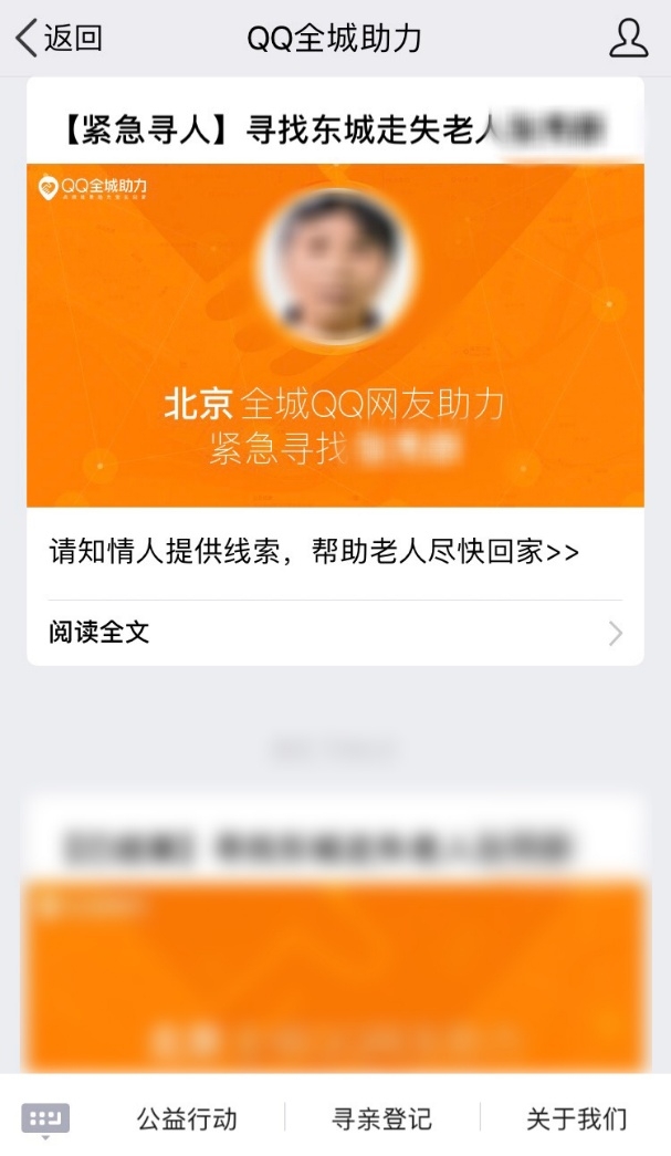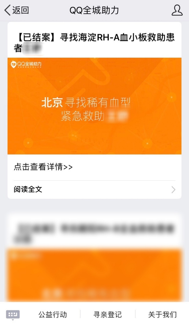 同時,與傳統尋人方式比擬,QQ全城助力發布的信息更具備可控性。例如傳統稀有血型公益組織會借助QQ群、伴侶圈等社交媒體平臺擴散求助信息,但是當匹配成功后相關消息還是會在社交平臺繼續擴散;而在QQ全城助力中,當成功尋找到志愿者后會推送“已結案”的信息,使求助信息可控,進而為社會節省公益資源。