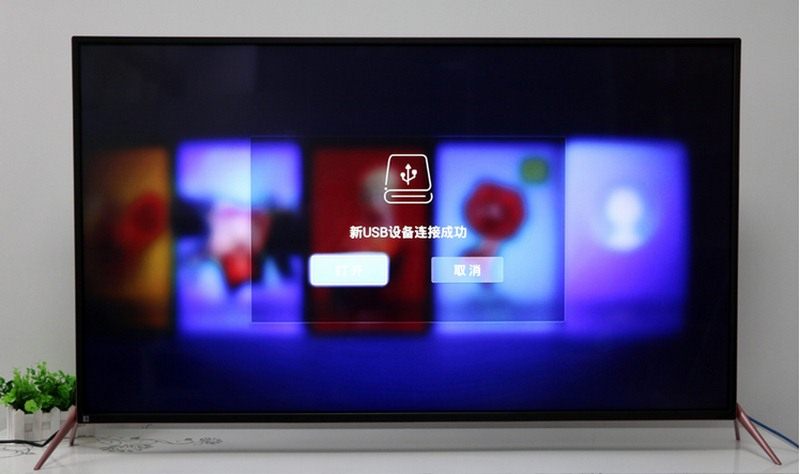 接著打開狂風TV,將U盤連接電視上的USB接口,,這時電視屏幕上會自動彈出識別外接設備的彈窗,點擊打開;