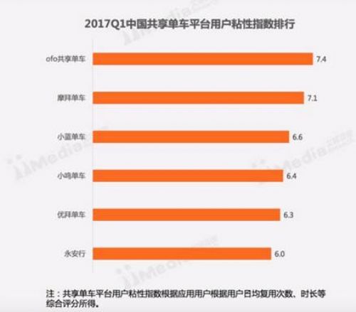 同時,《2017Q1 中國共享單車市場研究陳訴》還按照用戶日均復用次數、時長等綜合評分得出了一項關鍵指標——用戶粘性。在激烈的競爭下,用戶粘性將成為繼用戶量之后最值得關注的核心數據,在 2016 年中國共享單車粘性指數排行中,ofo共享單車以7. 4 分位居用戶粘性首位.