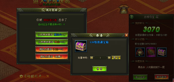 傲天盜墓條記古樓奪寶的過程中,還有其他的一些獎勵,好比積分累計到必然程度就可以收獲禮物和開啟寶箱。差別積分開啟的寶箱的價值完全差別,小編拿到了 3 次獎勵的機會。眼看最后一次 6000 積分的獎勵甚是豐厚,奈何時間有限小編只能放棄了。