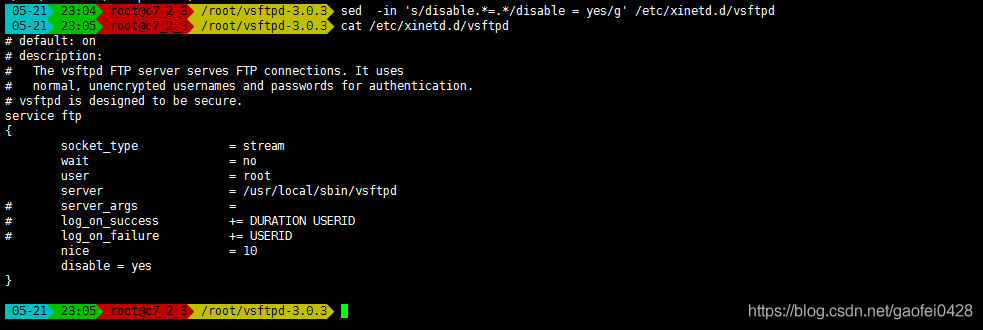 - sed -in 's/disable.*=.*/disable = yes/g' /etc/xinetd.d/vsftpd