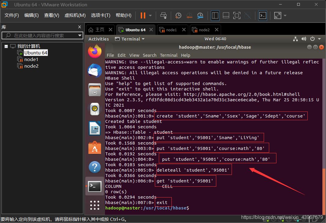 啟動完 hbase 之后 測試 簡單的 建表命令,插入數據命令,刪除數據命令等