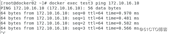 使用第二臺docker服務器上的容器test2對第一臺docker服務器上的容器test1進行ping測試