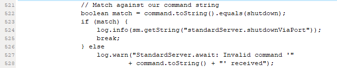 那么,現(xiàn)在的證據(jù)說(shuō)明,這個(gè)tomcat不是通過(guò)SHUTDOWN報(bào)文關(guān)閉的。而且,從下圖來(lái)看,也頗能說(shuō)明這個(gè)SHUTDOWN指令不是這么容易發(fā)成功的。