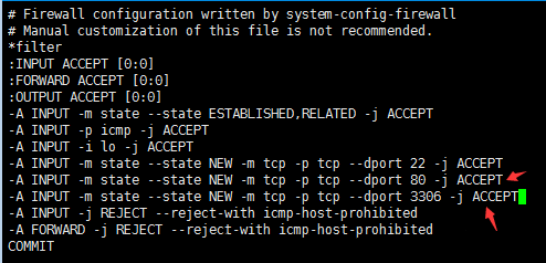 -A INPUT -m state --state NEW -m tcp -p tcp --dport 3306 -j ACCEPT #允許3306端口通過防火墻