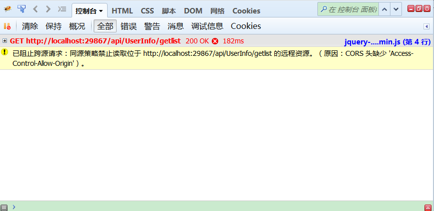 完成以上步驟以后,啟動WebAPI項(xiàng)目和Web項(xiàng)目,并在Web項(xiàng)目的Index頁面中點(diǎn)擊跨域獲取數(shù)據(jù)按鈕,打開瀏覽器控制臺查看請求結(jié)果,在控制臺會出現(xiàn)如下結(jié)果: