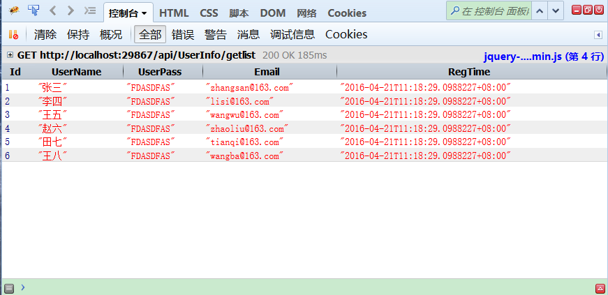 [{"Id":1,"UserName":"張三","UserPass":"FDASDFAS","Email":"zhangsan@163.com","RegTime":"2016-04-21T10:36:50.7800569+08:00"},{"Id":2,"UserName":"李四","UserPass":"FDASDFAS","Email":"lisi@163.com","RegTime":"2016-04-21T10:36:50.7800569+08:00"},{"Id":3,"UserName":"王五","UserPass":"FDASDFAS","Email":"wangwu@163.com","RegTime":"2016-04-21T10:36:50.7800569+08:00"},{"Id":4,"UserName":"趙六","UserPass":"FDASDFAS","Email":"zhaoliu@163.com","RegTime":"2016-04-21T10:36:50.7800569+08:00"},{"Id":5,"UserName":"田七","UserPass":"FDASDFAS","Email":"tianqi@163.com","RegTime":"2016-04-21T10:36:50.7800569+08:00"},{"Id":6,"UserName":"王八","UserPass":"FDASDFAS","Email":"wangba@163.com","RegTime":"2016-04-21T10:36:50.7800569+08:00"}]