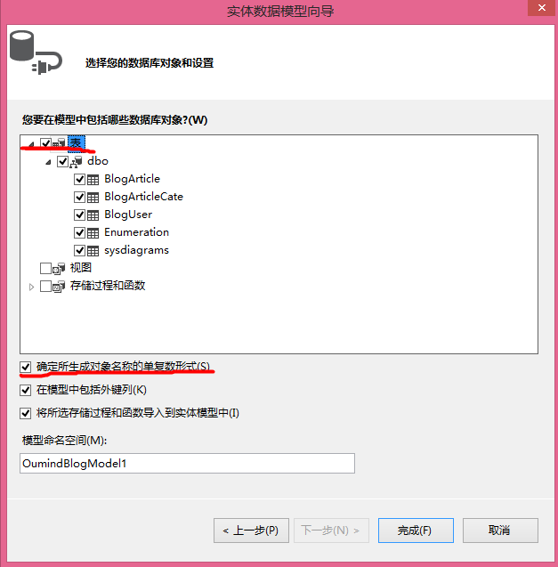 ⑤下一步,選擇需要在模型中包含的數據庫對象,選擇”確定所生成對象的單復數形式“,其它保持默認,點擊完成。如下圖: