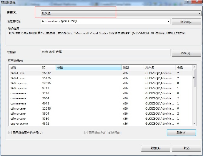 調試-附加到進程(注意傳輸選擇:默認值,限定符輸入遠程機IP )