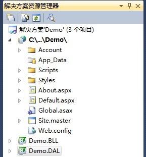 由圖可以知到,一個項目應有樣式、腳本,母版等,當然用VS2010建的一個項目用了Membership,我重來沒有用過。還是自已寫好。