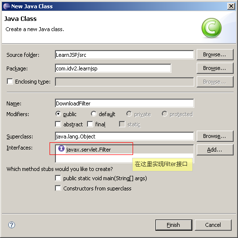 創建Filter時可惜不能像Servlet那樣,直接從右鍵菜單中選擇新建, 而只能先寫好源代碼然后手工添加到web.xml中。 如下圖,在新建類時注意要實現javax.servlet.Filter接口。