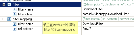 寫完代碼之后,打開web.xml文件,手工添加Filter。與Servlet類似,你需要添加 和 兩個標記。這里我們要對 /img/ 下的所有文件進行登錄驗證, 因此的 url-pattern 處我們填寫了 /img/* 。