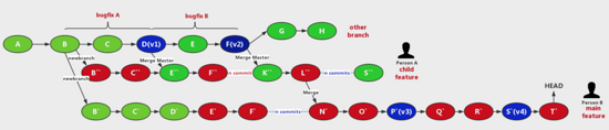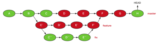 - 復制 F(v2) 替換 Master(v4),手動或應用 B'-D‘ commit 圖示情況,直接復制粘貼是個便捷的方法,再次回復 B'-D' 也費不了多大事,只是手動操作難免失誤,尤其是增加/刪除文件的情況,復制粘貼容易出錯