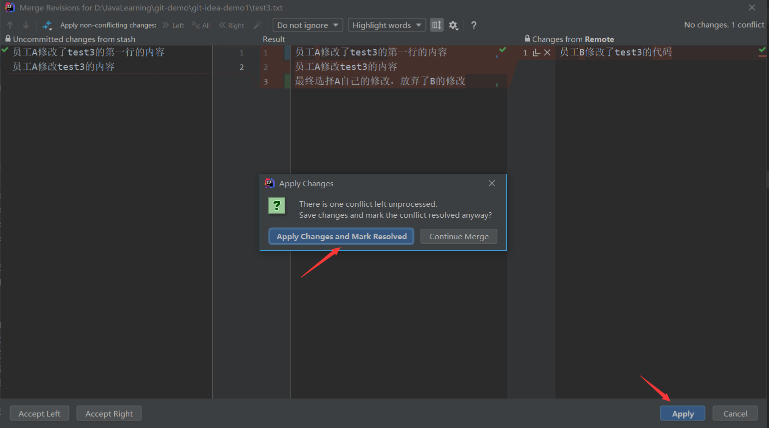 手動(dòng)處理沖突,最終選擇保留A自己的修改,以及額外又添加上了第三行修改