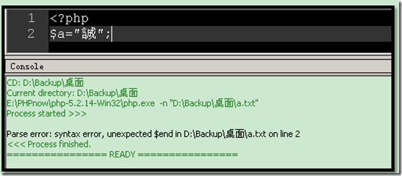 選擇gbk編碼,運行上面代碼,就一條簡單的命令導致出現錯誤,說字符串 賦值 沒有結束! 呵呵,估計很多人看到這個就會認為是php 出Bug了。但是,如果我們變成$a=”誠a”,發現可以正常運行了。是不是覺得很奇葩啦!!