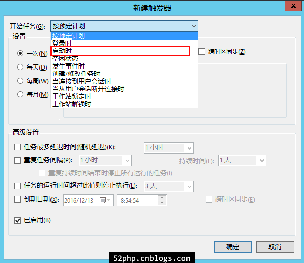 如果想開機啟動.bat文件,只要在“新建觸發器”時,“開始任務”下列框選擇“啟動時”即可!