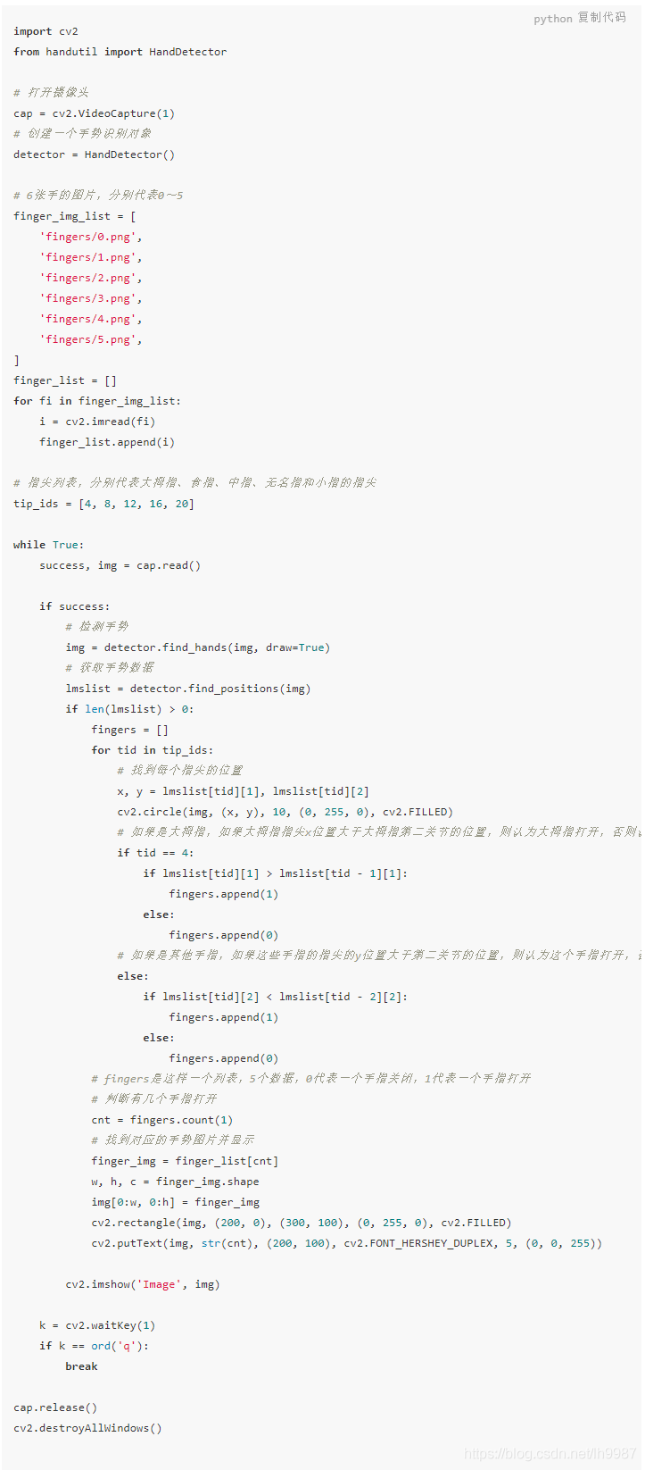 從上圖可知:4, 8, 12, 16, 20分別代表大拇指、食指、中指、無名指和小指的指尖。完整代碼如下: