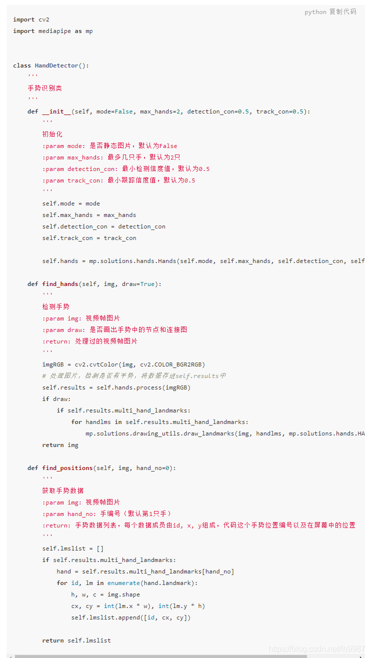 編寫一個handutil.py模塊,這個handutil模塊有一個HandDetector類,提供了檢測手勢、獲取手勢數(shù)據(jù)的方法。代碼如下,詳細解釋看代碼注釋: