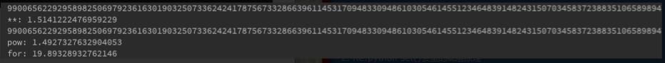 非常恐怖的對比,pow和**都只用了1.5秒,而for循環用來20秒!,所以可以肯定的是,pow底層絕對不是用循環去求解的