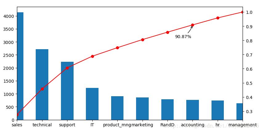 左邊為出現的頻率,右邊為累積百分比(這里數據以降序排列較好,便于直觀地觀察),效果如下: