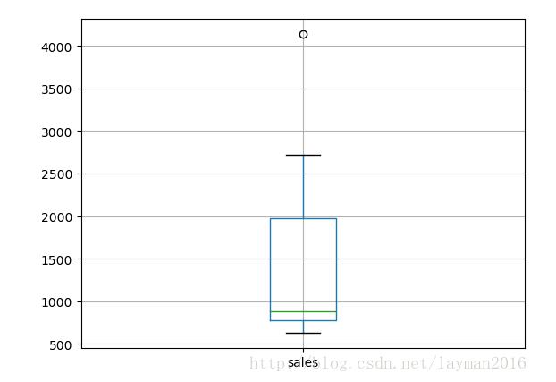 使用pandas畫箱型圖簡單方便,但是注釋比較麻煩,可以用annotate添加異常點的注釋。若使用之前的數據va,則先創建二維數據框再畫圖。如果有多個列為數字類型,那么可以畫每個列的箱型圖,這里只有一列數據,如下: