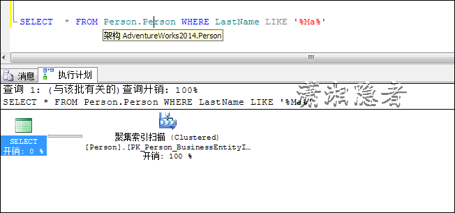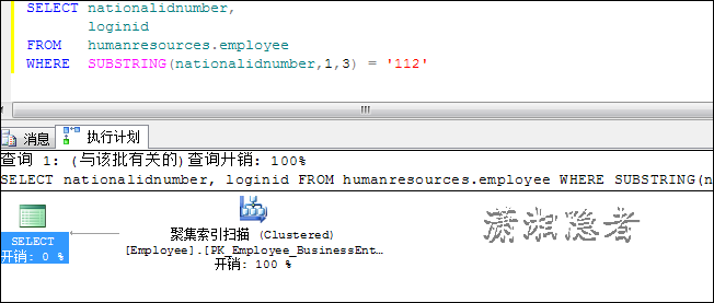 如下示例,AdventureWorks2014數據庫的HumanResources.Employee表,由于NationalIDNumber字段類型為NVARCHAR,下面SQL發生了隱式轉換,導致其走索引掃描(Index Scan)