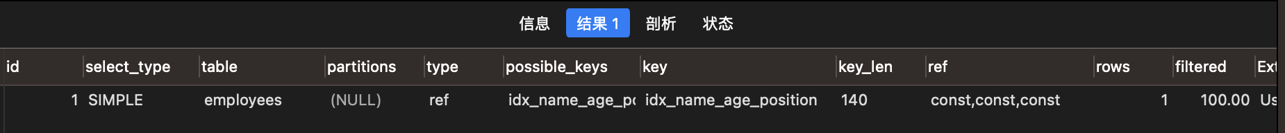 EXPLAIN SELECT name,age FROM employees WHERE name= 'LiLei' AND age = 23 AND position ='manager';