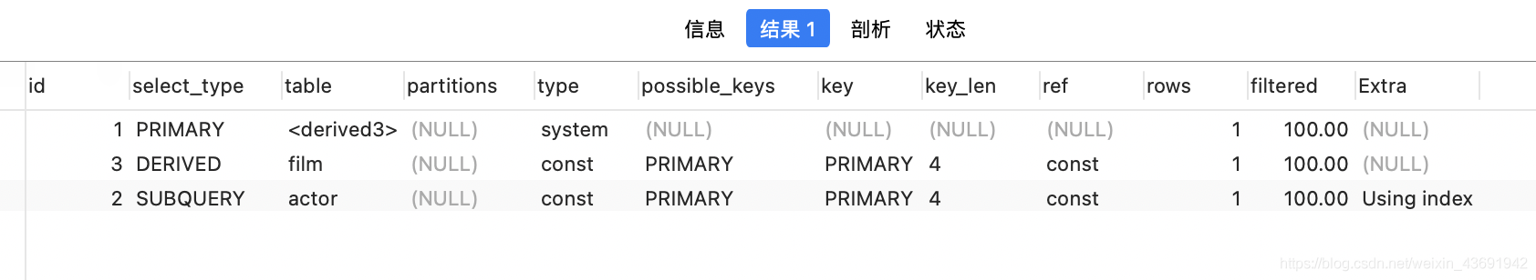 id為1 的sql最后執行,它是復雜查詢中最外層的 select,所以對應的select_type為primary。